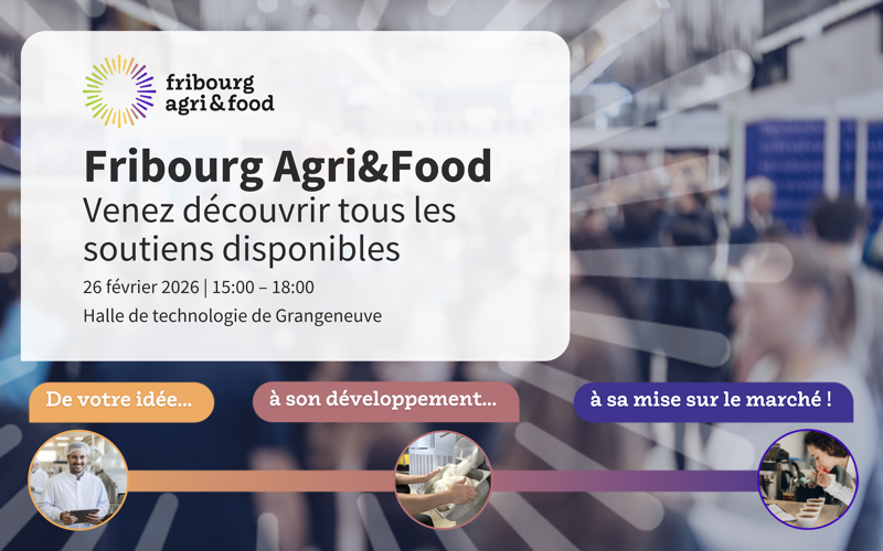 Le 26 février 2026, venez découvrir tous les soutiens disponibles de Fribourg Agri&Food pour vos projets agroalimentaires: stands, démonstrations, dégustations et expert·es de la filière agroalimentaire à votre disposition pour accompagner vos projets, de l'idée à la mise sur le marché.