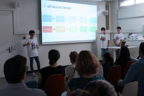 Cinq projets ont été développés puis présentés en public le vendredi après-midi, devant une soixantaine de personnes: proches, partenaires et curieux réunis au sein de l’Innovation Lab. Une occasion pour les jeunes de valoriser leur travail et de vivre une expérience concrète de prise de parole en public.