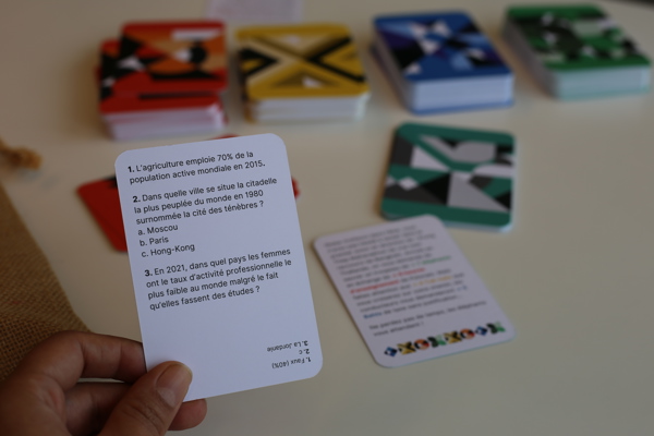Après ce long travail, l’équipe de MMXXX propose un jeu de 210 cartes et 600 questions au design coloré, pensé et réalisé par F+F studio, entreprise locale fribourgeoise et imprimé à la Fondation Alfaset de la Chaux-de-Fonds, un atelier protégé qui emploie des personnes en réinsertion professionnelle ou en situation de handicap. Ils espèrent pouvoir écouler les 300 exemplaires issus de leur première production et ainsi pouvoir rembourser la somme qui leur a été mise à disposition au départ (1000 CHF chacun).