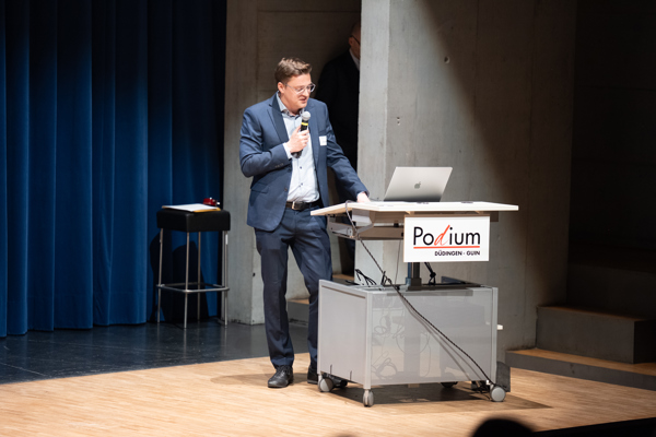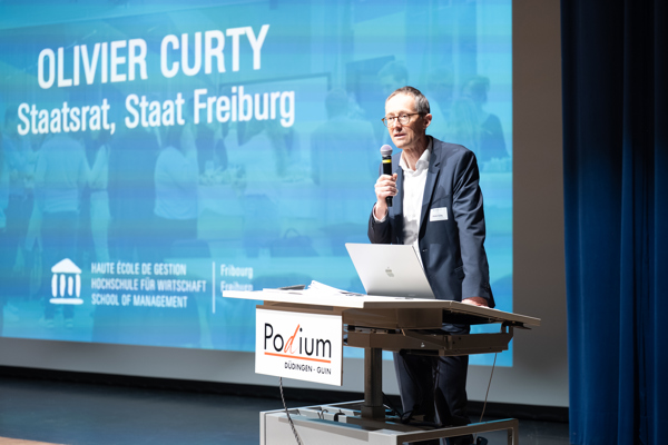 Die Hochschule für Wirtschaft Freiburg (HSW) führte am Dienstag, 11. März, im Podium Düdingen das erste Deutschfreiburger Wirtschaftsforum durch. Rund 100 Unternehmerinnen, Unternehmer und Interessierte folgten der Einladung und tauschten sich zu zukunftsweisenden Themen wie Nachfolgeplanung, Viertagewoche und Energieeffizienz aus.