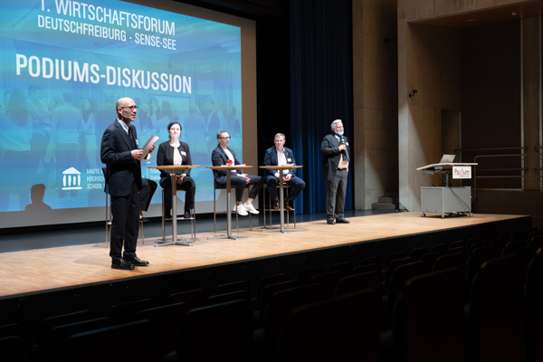Die Hochschule für Wirtschaft Freiburg (HSW) hat mit dem ersten Wirtschaftsforum Deutschfreiburg rund 100 Teilnehmende aus Wirtschaft und Politik zur Vernetzung und zum Austausch zu strategischen Erfolgsfaktoren nachhaltiger Unternehmen zusammengebracht.